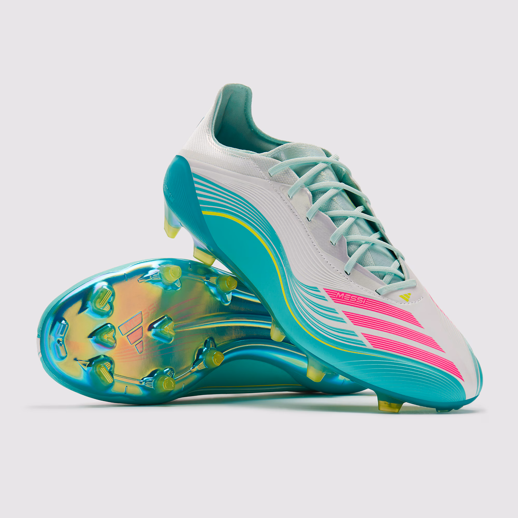 רדפו אחר התהילה כמו ליאו עם נעלי כדורגל בצבעי לבן/ורוד צלול/אקווה פלאש. נעלי ה-Messi F50, שעוצבו בשיתוף פעולה עם ה-GOAT עצמו, מוסיפות את הסגנון הייחודי של מסי למהירות של ה-F50, וכוללות את לשון ה"בוריטו" האהובה עליו ו-3 פסים מעוצבים.