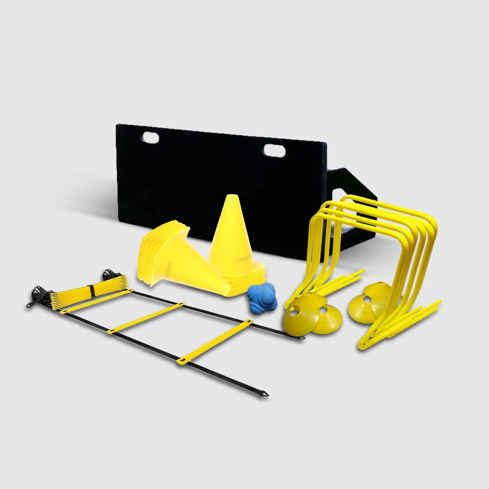 ערכת אימון פרימיום עם סולם, קונוסים, משוכות וכדור תגובה.
